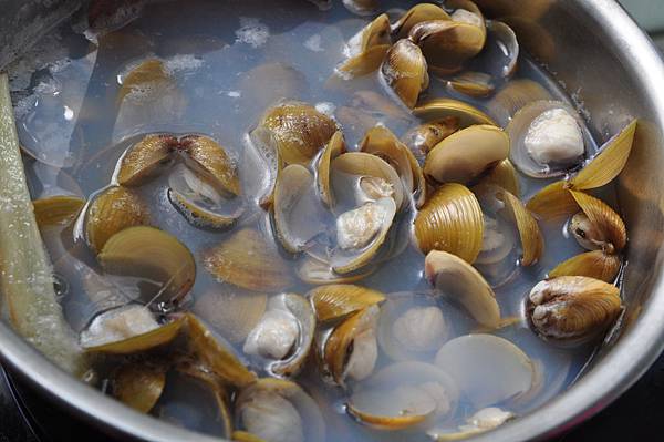 1.先製作蜆精,以水和蜆及薑片滾煮沸騰