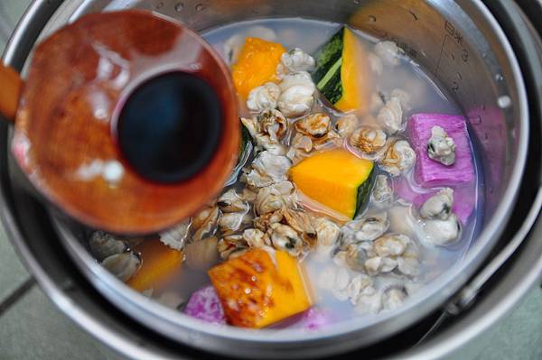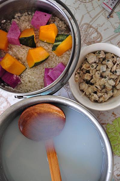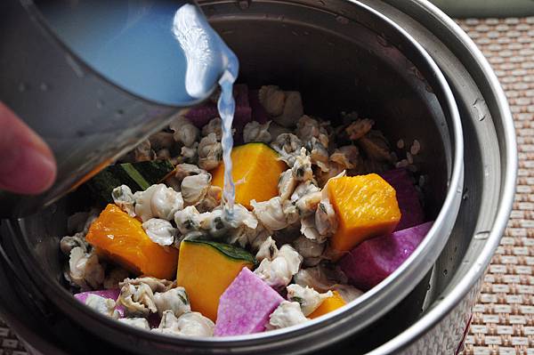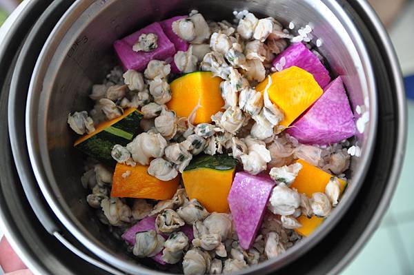 3.將洗淨白米置放內鍋,鋪上山藥塊及南瓜塊,再鋪滿蜆肉