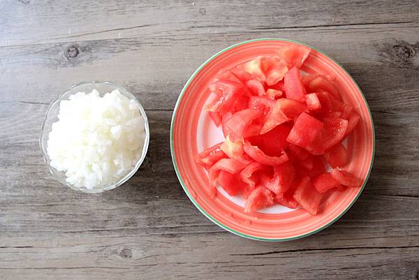 2.洋蔥切末、蕃茄去皮切小塊狀。