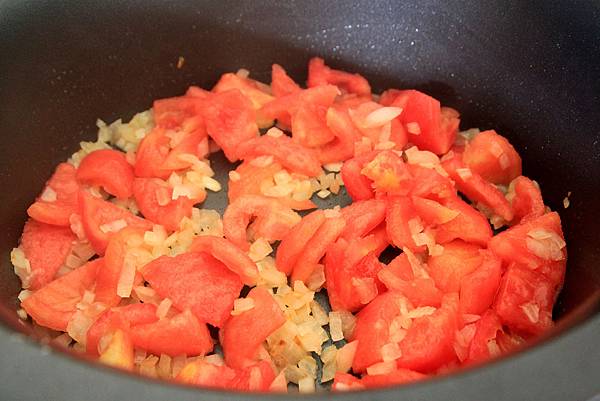 5.鍋中放少許食用油,先將洋蔥末與蕃茄丁炒軟並炒出香氣。