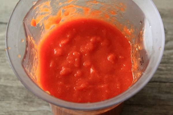 6.將炒軟的蕃茄丁與洋蔥末取出,加入蕃茄醬後打成蕃茄糊。(新鮮番茄煮出來的湯底微酸,顏色較淡。加入蕃茄醬調出色澤,讓湯色鮮紅可口)