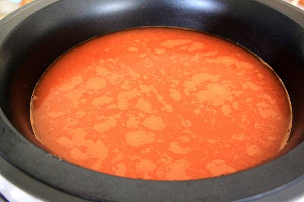 7.接著將番茄糊與水1200cc加入《大同複合料理無水鍋》的「湯鍋」中。