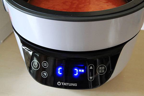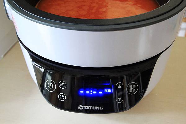 9.按下【開始】鍵進行燉煮,同時也會發出1聲提示音,表示無水鍋已經開始進入烹煮狀態,螢幕也會同時顯示動態循環狀態。只需燉煮10分鐘再加適量鹽調味,湯底就完成囉!(天然的蕃茄湯底偏微酸,怕酸可再加一點點糖調味)