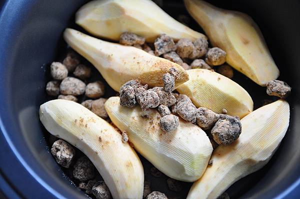 3.打開鍋蓋,稍微翻動一下地瓜,讓地瓜充分吸收溶化的黑糖水。
