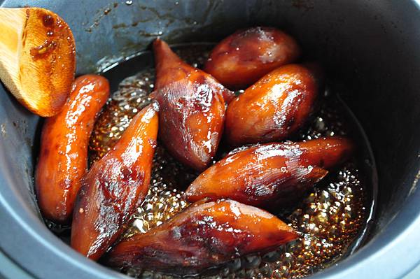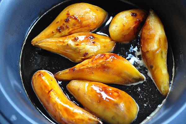 5.烹煮期間可以15分鐘就開鍋翻動一下地瓜讓其均勻吸收黑糖醬汁及上色,到黑糖醬汁稍稍收乾即完成。