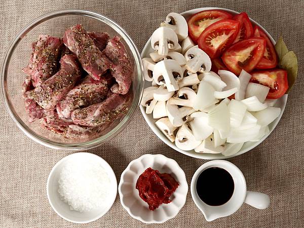 1.備好所有食材。牛肋條先切除肉上過多白色油脂,再切成4-5公分段長,並均勻撒上【牛肉醃料】,冷藏醃製30分鐘入味。牛番茄每顆均切四大塊,洋蔥切丁。洋菇大朵切4瓣,小朵不切。 ►402不鏽鋼刀具組5折
