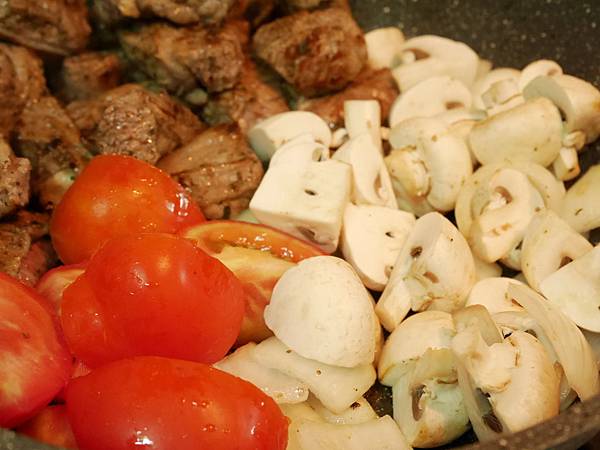 2.取一鍋,冷鍋不放油,放入牛肋條以中大火乾煎至焦香。再放進洋蔥丁、洋菇塊、番茄塊炒香。接著,下【調味料】,整鍋拌炒均勻。(總耗時約8-10分鐘)►限量陶瓷不沾鍋組