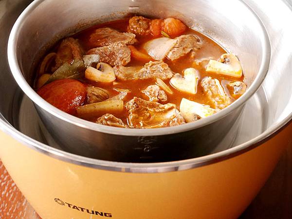 3.取一電鍋,(內鍋)放進步驟2已完成的炒料,再加進1米杯清水量拌勻。(外鍋)加進2米杯水量,重覆進行2次即可。(總耗時約60分鐘)