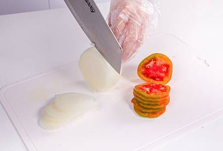 ↑↑↑準備蔬菜配料,將蕃茄切片,洋蔥切成圈,生菜洗淨剝片