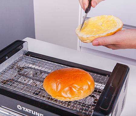 ↑↑↑漢堡對切抹上乳瑪琳,放上烤爐2-3分鐘