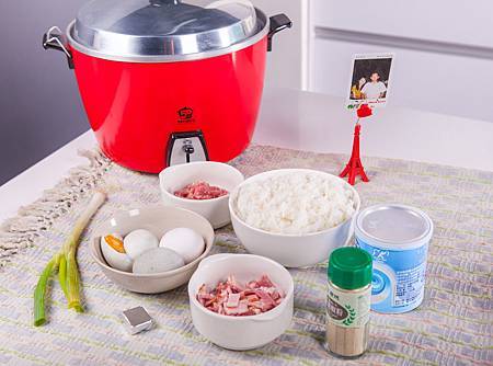 白飯600g、豬絞肉40g、培根40g、雞蛋2顆、皮蛋3顆、鹹蛋1顆、排骨湯塊1個(高湯)、