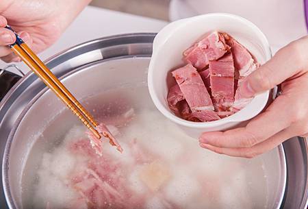 將白飯放入加了1800cc水的內鍋中,再將排骨湯塊、豬絞肉、培根、鹽、白胡椒也一併加入,