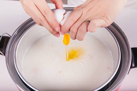 保溫開關跳起之後,打入2顆雞蛋,充分將蛋花攪拌均勻,外鍋加入半杯水再加熱一次
