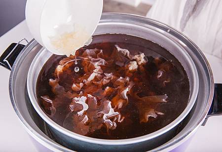 2. 再加入2400cc熱水、紅砂糖與白木耳(用水洗淨),電鍋外鍋加2杯水,按下加熱開關