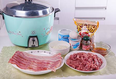 豬絞肉(半肥半瘦)500g、培根150g、糯米600g、雞蛋1顆、鹽1/2茶匙、