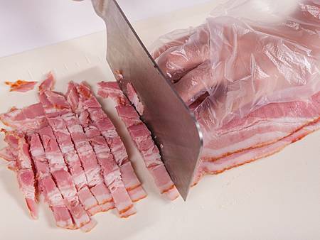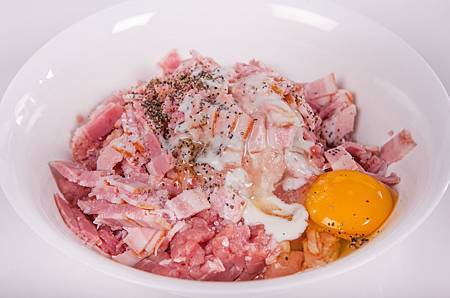 將培根切成小片之後加入豬絞肉,並加入雞蛋、黑胡椒、鹽、 優格、太白粉調味,