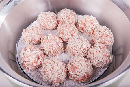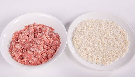 準備好攪拌均勻的絞肉與泡過水的糯米(約泡水兩小時之後瀝乾水份),