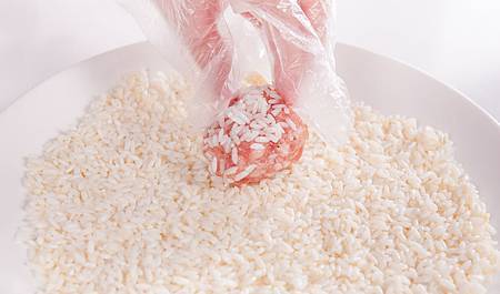 就可以開始將揉成丸狀的絞肉放上糯米滾一滾。