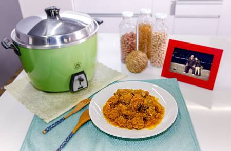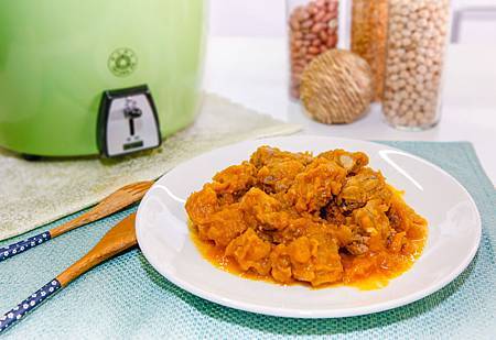 將拌勻之後的南瓜跟排骨放進電鍋蒸熟 (外鍋兩杯水蒸到熟)