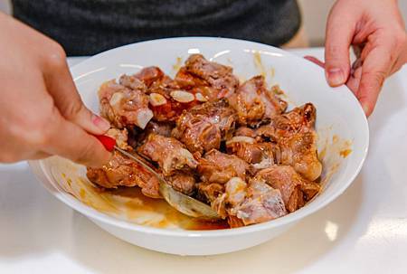 排骨用熱水滾燙去血水後,和調味料拌勻醃至隔夜