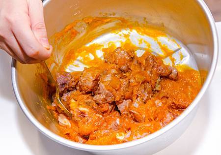再將蒸好的南瓜壓成泥,倒入醃好的排骨拌勻