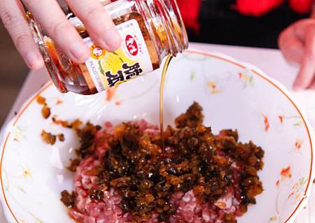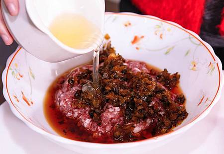 將脆瓜切碎之後,拌入豬絞肉中,同時加入脆瓜罐頭中的湯汁(整罐)、白胡椒粉些許、蔥花些許