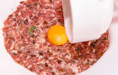 攪拌完畢後取一平盤,將絞肉鋪平於其上,中間以湯匙背部壓出一凹槽,將蛋黃放入其中。