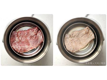 1. 蒸二層肉的部份,將一片二層肉正反面皆塗上薄鹽,小電鍋內鍋外鍋放1杯水,電鍋跳停即可取出,