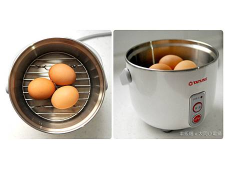 2. 水煮雞蛋很容易裂,用電鍋蒸一樣外鍋放一杯水跳停即可,不用擔心蛋沒熟,也不用在瓦斯爐旁顧著火,