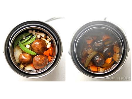 3. 滷香菇蘿蔔的部份,蘿蔔洗淨削皮切塊放入內鍋,香菇、豆莢、半包的好菇道也是洗淨後放入內鍋,