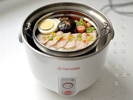 5. 輕巧可愛的「大同新款三人份小電鍋」,是簡約的白色,且不佔空間,內鍋就是個大便當盒(照片中便當盒是一般市售圓形便當盒)。