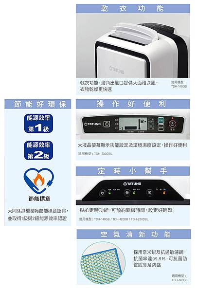 3. 其他貼心功能:乾衣功能、空氣清淨功能、節能標章、簡易操做、定時小幫手