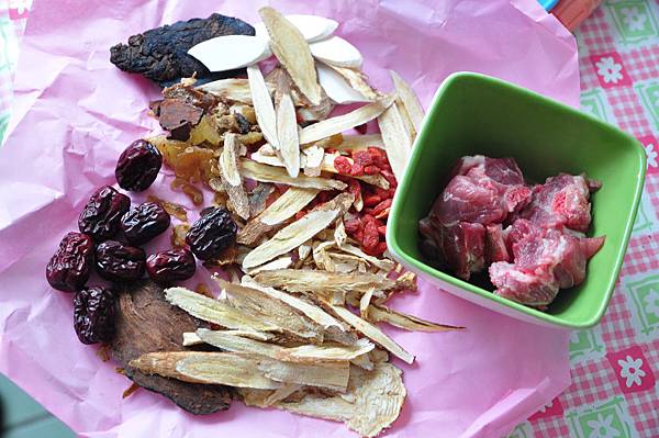 粉光蔘、黃耆、紅棗、當歸、枸杞子、生地、玉竹、首烏、甘草、淮山等藥材